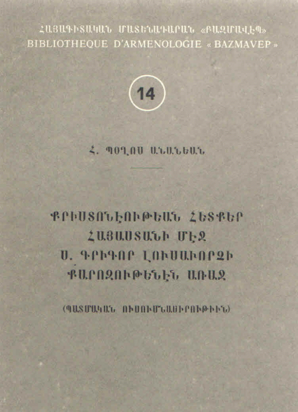 - Քրիստոնեության հետքեր Հայաստանի մեջ Ս. Գրիգոր Լուսավորչի քարոզութենեն առաջ : (Պատմական ուսումնասիրություն) [Added title page title]
