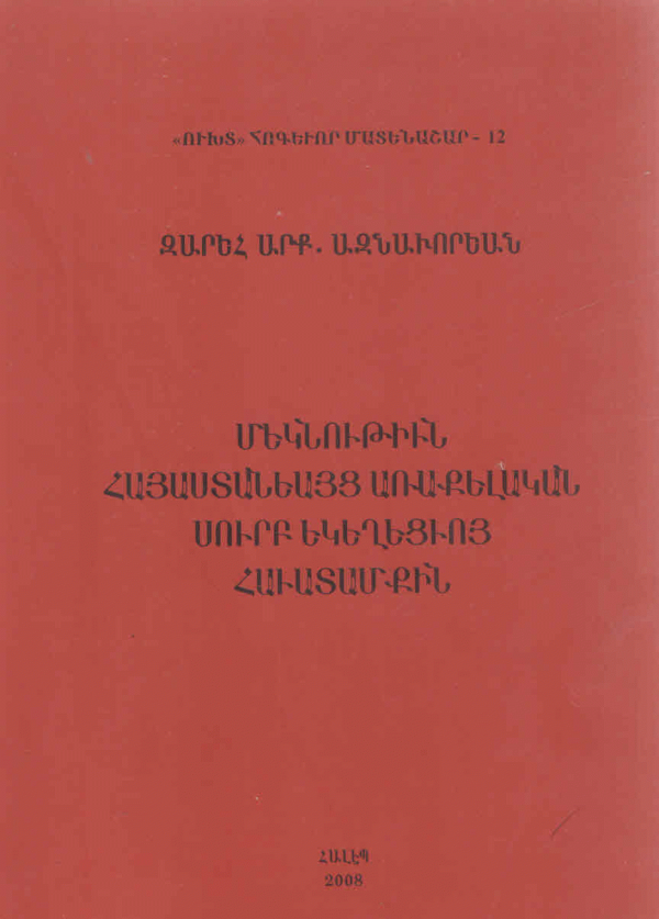 | Հովհ-1111 Հայոց եկեղեցու պատմություն / | Հովհ-1158 Հայաստանեայց Աւետարանական եկեղեցին / | Հովհ-1174 Հայ եկեղեցին 20-րդ դարուն եւ 21-րդ դարու շէմին / | Հովհ-1175 Մեկնութիւն Հայաստանեայց Առաքելական Սուրբ Եկեղեցւոյ հաւատամքին / | Հովհ-1184 Հող, մարդ և գիր / | Հովհ-1192 Սուրբ Էջմիածինը տաղերի մեջ / | Հովհ-1272 Ներսէս Լամբրոնացի : Աշխատասիրություն պատմական, մատենագրական և վարդապետական / |