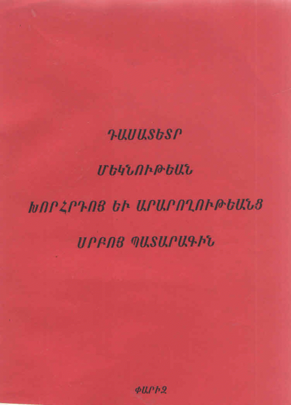 Մայր Աթոռ Սուրբ Էջմիածին «Վաչե և Թամար Մանուկյան» Մատենադարան | Գրապահոց | 264:281.62/Դ-21 (Browse shelf(Opens below)) | Available | Սպասարկվում է ընթերցասրահ | 21227 |