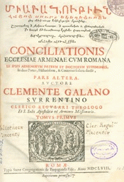 Բ տիտղթ. ՄԻԱԲԱՆՈՒԹԻՒՆ/ՀԱՅՈՑ սուրբ եկեղեցւոյն,/ ընդ մեծի ս[ուր]բ Եկեղեցւոյն Հռովմայ :/ Շարադրեալ ի յերկուս հատորս. ի պատմական և ի վիճաբանական./ Ի կարգէ Թէատինոսաց Կղէմէս վարդապետէ/երկրորդ ՀԱՏՈՐԻՆ :/ ՄԱՍՆ ԱՌԱՋԻՆ/ CONCILIATIONIS/ECCLESIAE ARMENAE CVM ROMANA/ EXIPSIS ARMENORVM PATRVM ET DOCTORVM TESTIMONIIS,/ In duas Partes, Historialen, & Controuersialem diuisae,/ PARS ALTERA./ AVCTORE/ CLEMENTE GALANO/ SVRRENTINO/ CLERICO REGVLARI THEOLOGO/ Et. S/ Sedis Apostolicae ad Armenos Missionario./ TOMVS SECVNDVS./ ROMAE/ Typis Sacrae Congregationis de Propaganda Fide. Anno MDCL VIII./ Superiorum permissu./ (Հտ. 2, Մաս 1 )