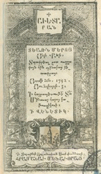 Տպագրեալ ըստ ուղղա/գոյն հին օրինակւսց ձե-/ռագրաց։/ Յամի տ[եառ]ն. 1752./ Յունվարի. Յ։/ Ի հայրապետութե[ան] Տ[եառ]ն/ Մինասայ հայոց կա/թուղիկոսի։/ Ի ՎԷՆԷՏԻԿ։/ Ի Տպար[ա]նի Որլանտեան Ստեփաննոսի/ ՀՐԱՄԱՆԱՒ ՄԵԾԱՒՈՐԱՑ։/