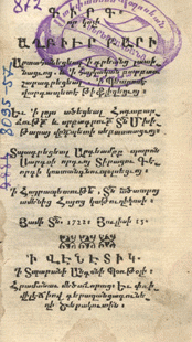 [ՏԻՏՂԹ.՝ Գիրգ:/ որ կոչի/ ԱՂԲԻՒՐ ԲԱՐԻ/ Արտահանեցեալ ի գրեանց լատի/նացւոց. և ի հայկական բարբառ/ շարադրեցեալ. ի Պետրոսէ Վարդապետէ Թիֆլիզեցւոյ։/ Եւ ի լոյս ածեցեալ Հոգաբար-/ձութ[եամ]բ և սրբագրու[թեամ]բ Տ[եառ]ն Մխի/թարայ վ[ա]րդ[ա]պետի սեբաստացւոյ:/ Տպագրեցեալ Արդեամբք պարոն/ Սարգսի որդւոյ Տիրացու Գէ/որգի կոստանդնուպօլսեցւոյ:/ ի Հայրապետութե[ան], Տ[եառ]ն ա[ստուա]ծատրոյ/ ամենից Հայոց կաթուղիկոսի:/ Յամի Տ[եառ]ն. 1722։ Յուլիս 15. / Ի ՎԷՆԷՏԻԿ./ ի Տպարանի Անդօնի Պօռթօլի։/ Հրամանաւ մեծաւորաց։ Եւ փռի/վիլէճիով գերազանցագունե/ղի ծերակուտին/]: