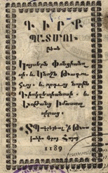 ԳԻՐՔ/ ՊԱՏՄՈՒ/թեան Կայսերն Փոնցիանո/սի. և Կնոջն Թագու/հւոյ. և որդւոյ նորին/ Դիոկղիտիանոսի. և/ Եօթանց Իմաստա/սիրաց։ Տպագրեցեալ ի Թուա/կանիս մերոյ Հայոց/ 1189։/