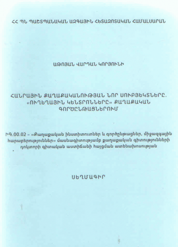 Հանրային քաղաքականության նոր սուբյեկտները. «Ուղեղային կենտրոնները» քաղաքական գործընթացներում։ Սեղմագիր / Վ. Կ. Աթոյան ; ՀՀ պաշտպանական ազգային հետազոտական համալսարան