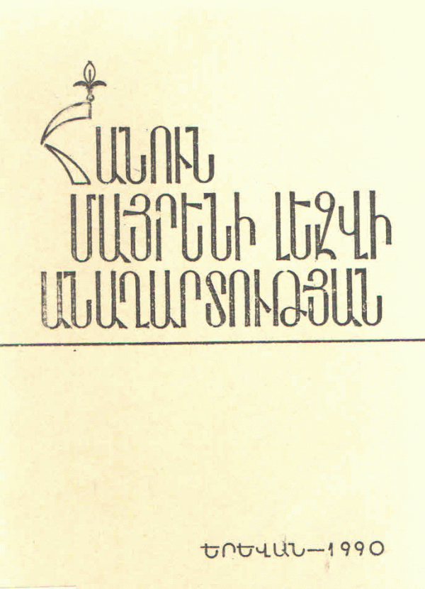 Հանուն մայրենի լեզվի անաղարտության : Գրականության հանձնարարական ցանկ / Կազմ.՝ Մ. Կարապետյան ; խմբ.՝ Վ. Ալեքսյանյան ; ՀԽՍՀ Կուլտուրայի մինիստրություն ; Ալ. Մյասնիկյանի անվան ՀԽՍՀ պետական գրադարան