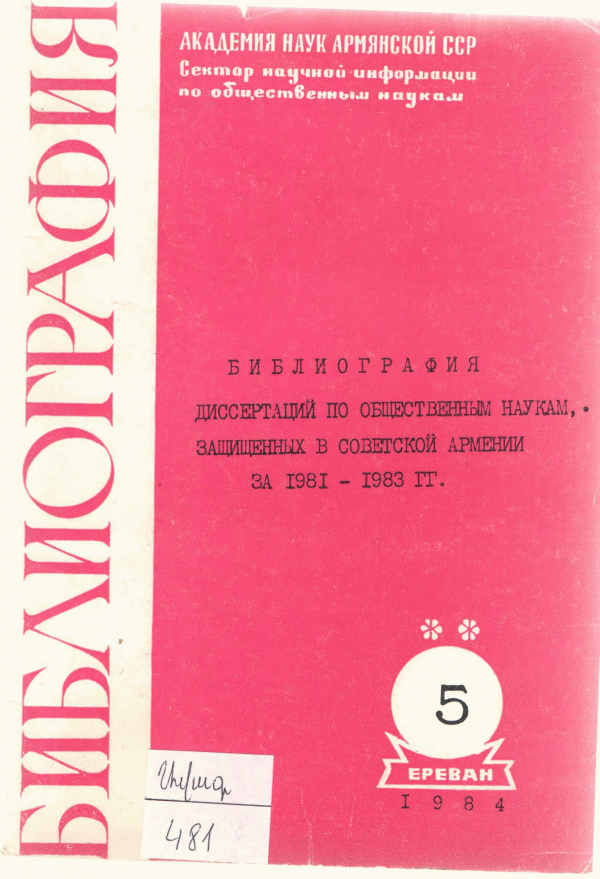 Библиография десертаций по обшественным наукам, защищенных в Советской Армении за 1981-1983 гг. / Гл. ред.: Х. Барсегян ; ред.: В. Алексанян, Л. Карапетян, С. Саркисян ; состав.: Л. Еркнапетян, Л. Закарян ; Академия наук Армянской ССР, Центр научной информации по общественным наукам