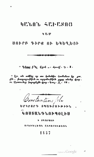 TextLanguage: Armenian Publication details: Կ. Պոլիս : Ի Տպարանի Արեւելեան ընկերութեան, 1857. Edition: Երկրորդ տպագրութիւնDescription: ԻԵ, 389, 1 չհամարակալված էջ ; Շարվ. 14x7,5 սմ ; 18 սմOther title: - [Կանոն հավատո կամ Սուրբ գիրք ու եկեղեցի]