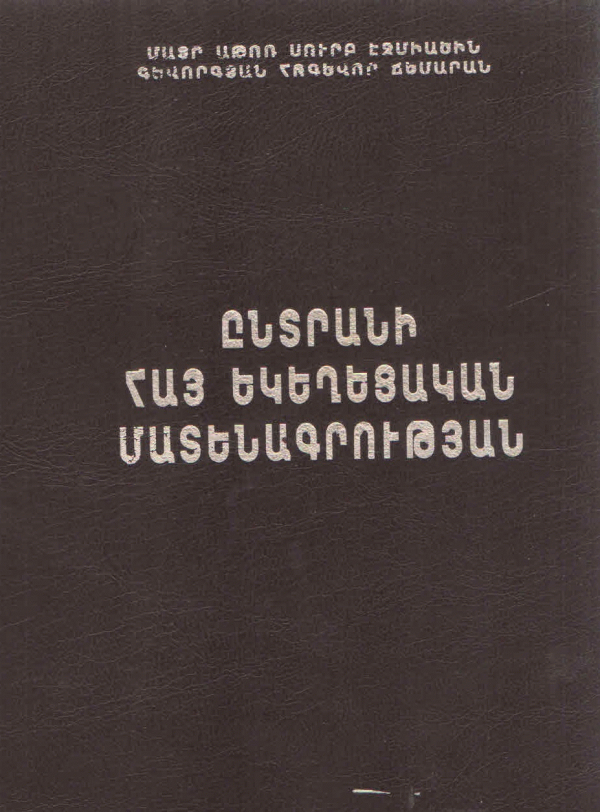 Մայր Աթոռ Սուրբ Էջմիածին «Վաչե և Թամար Մանուկյան» Մատենադարան | Գրապահոց | 276:281.62/Ը-61 (Browse shelf(Opens below)) | Available | Սպասարկվում է 30 օր | Հովհ-454 |