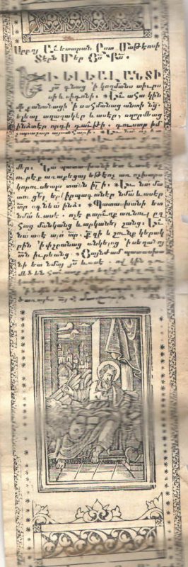 [Ժապավենաձև հմայիլ երկարությունը 8 մետր 70 սմ, լայնությունը 9 սմ։ Զարդաեզր։ Տպագրության լայնքը 8,5 սմ։ Բաղկացած շուրջ 43 սմ երկարություն ունեցող միմյանց սոսնձված թերթերից։ 29 փորագիր պատկեր, որոնցից մի քանիսի վրա փորագրողի՝ Գրիգոր Մարզվանեցու անվանատառերը։ Առկա են Գլխազարդեր և զարդագրեր։ Բնագիրը 8 և 12 կետաչափի բոլորագրով, օգտագործված են նաև գլխագրեր և նոտրգիր։]