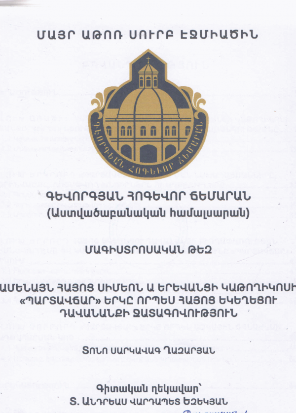 Ամենայն հայոց Սիմեոն Ա Երևանցի կաթողիկոսի «Պարտավճար» երկը որպես Հայոց եկեղեցու Դավանանքի ջատագովություն ։ (Մագիստրոսական թեզ) / Տ․ սրկ․ Ղազարյան ; Գիտ․ Ղեկավար Տ․ Անդրեաս վրդ․ Եզեկյան ; Մայր Աթոռ Սուրբ Էջմիածնի Գևորգյան հոգևոր ճեմարան